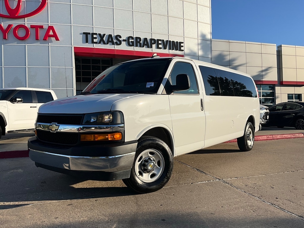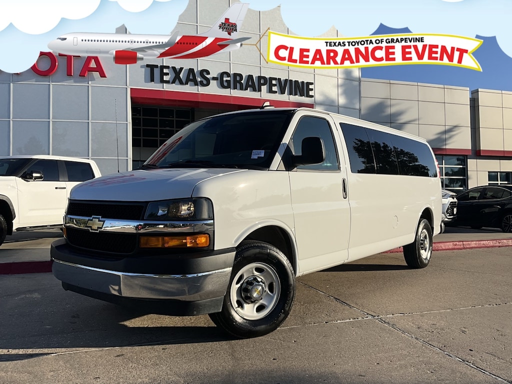 Located just minutes from DFW Airport, Texas Toyota of Grapevine is the premier Toyota dealership to meet all of your needs. Clean CARFAX. Backup Camera, LED Accent Lighting, Night Vision Auto-Dimming Mirror, Wheels, ACROSS FROM DFW AIRPORT, Apple CarPlay Compatible, Android Auto, 15-Passenger Seating (2-3-3-3-4 Seating Config), 3rd row seats: bench, 4-Wheel Disc Brakes, 4th-Row Bench Seat, ABS brakes, AM/FM radio, AM/FM Stereo w/MP3 Player, Chrome Appearance Package, Chrome Grille, Compass, Custom Cloth Seat Trim, Delay-off headlights, Deluxe Console w/Swing Out Storage Bin, Driver door bin, Driver vanity mirror, Driver's Seat Mounted Armrest, Dual front impact airbags, Dual front side impact airbags, Electronic Stability Control, Emergency communication system: OnStar and Chevrolet connected services capable, Forward Collision Alert, Front & Rear Chrome Bumpers w/Step-Pad, Front anti-roll bar, Front Bucket Seats, Front reading lights, Front wheel independent suspension, Full-Floor Color-Keyed Carpeting, Fully automatic headlights, Heated door mirrors, Illuminated entry, Keyless Entry Control Module (LPO), Lane Departure Warning System, Low tire pressure warning, Occupant sensing airbag, Overhead airbag, Panic alarm, Passenger cancellable airbag, Passenger door bin, Passenger seat mounted armrest, Passenger vanity mirror, Power door mirrors, Power windows, Preferred Equipment Group 1LT, Rear air conditioning, Rear Park Assist, Rear reading lights, Reclining Front Bucket Seats w/Inboard Armrests, Remote Keyless Entry, Remote keyless entry, Security system, Side Blind Zone Alert, Sliding Passenger-Side Door, Speed control, Tachometer, Theft Alarm Notification, Tilt steering wheel, Traction control, Trip computer, Variably intermittent wipers, Voltmeter, Wheel Trim w/Chrome Center Caps, 12-Passenger Seating (2-3-3-4 Seating Config), 16" x 6.5" Steel Wheels, 2 Speakers, 3.42 Rear Axle Ratio, Air Conditioning, Bumpers: chrome, Power steering, Lane Departure Warning System, Rear Park Assist, Side Blind Zone Alert, Forward Collision Alert, 15-Passenger Seating (2-3-3-3-4 Seating Config), 3rd row seats: bench, 4-Wheel Disc Brakes, 4th-Row Bench Seat, ABS brakes, AM/FM radio, AM/FM Stereo w/MP3 Player, Chrome Appearance Package, Chrome Grille, Compass, Custom Cloth Seat Trim, Delay-off headlights, Deluxe Console w/Swing Out Storage Bin, Driver door bin, Driver vanity mirror, Driver's Seat Mounted Armrest, Dual front impact airbags, Dual front side impact airbags, Electronic Stability Control, Emergency communication system: OnStar and Chevrolet connected services capable, Forward Collision Alert, Front & Rear Chrome Bumpers w/Step-Pad, Front anti-roll bar, Front Bucket Seats, Front reading lights, Front wheel independent suspension, Full-Floor Color-Keyed Carpeting, Fully automatic headlights, Heated door mirrors, Illuminated entry, Keyless Entry Control Module (LPO), Lane Departure Warning System, Low tire pressure warning, Occupant sensing airbag, Overhead airbag, Panic alarm, Passenger cancellable airbag, Passenger door bin, Passenger seat mounted armrest, Passenger vanity mirror, Power door mirrors, Power windows, Preferred Equipment Group 1LT, Rear air conditioning, Rear Park Assist, Rear reading lights, Reclining Front Bucket Seats w/Inboard Armrests, Remote Keyless Entry, Remote keyless entry, Security system, Side Blind Zone Alert, Sliding Passenger-Side Door, Speed control, Tachometer, Theft Alarm Notification, Tilt steering wheel, Traction control, Trip computer, Variably intermittent wipers, Voltmeter, Wheel Trim w/Chrome Center Caps. CARFAX One-Owner.