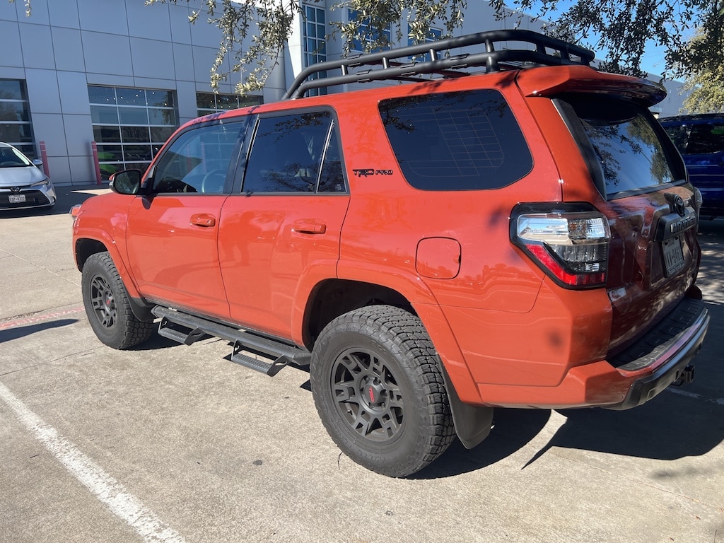 Located just minutes from DFW Airport, Texas Toyota of Grapevine is the premier Toyota dealership to meet all of your needs. Clean CARFAX. Backup Camera, LED Accent Lighting, Night Vision Auto-Dimming Mirror, Wheels, ACROSS FROM DFW AIRPORT, PRE COLLISION SYSTEM WITH PEDESTRIAN DETECTION, LANE DEPARTURE ALERT WITH SWAY WARNING, AUTO HIGH BEAMS, DYNAMIC RADAR CRUISE CONTROL, Push Button Start, Apple CarPlay Compatible, Android Auto, 4WD, 15 Speakers, 20" Wheels, 3.727 Axle Ratio, 4-Wheel Disc Brakes, ABS brakes, Air Conditioning, AM/FM radio: SiriusXM, Anti-whiplash front head restraints, Apple CarPlay/Android Auto, Auto High-beam Headlights, Auto tilt-away steering wheel, Auto-dimming Rear-View mirror, Automatic temperature control, Black Lug Nuts, Brake assist, Bumpers: body-color, Compass, Driver door bin, Driver vanity mirror, Dual front impact airbags, Dual front side impact airbags, Dual Zone Auto Climate Control, Electronic Stability Control, Emergency communication system: Safety Connect (1-year trial), Exterior Parking Camera Rear, Fog Lights, Fox Shocks, Front anti-roll bar, Front Bucket Seats, Front Center Armrest, Front dual zone A/C, Front fog lights, Front reading lights, Front wheel independent suspension, Garage Door Opener, Heated door mirrors, Heated Front Bucket Seats, Heated front seats, Heated Outside Rear-View Mirrors, Illuminated entry, Knee airbag, Leather Shift Knob, Low tire pressure warning, Moonroof w/Tilt Up & Slide, Multi-Terrain Back Monitor, Navigation System, Occupant sensing airbag, Outside temperature display, Overhead airbag, Overhead console, Panic alarm, Passenger door bin, Passenger vanity mirror, Power door mirrors, Power driver seat, Power moonroof, Power passenger seat, Power steering, Power windows, Radio: Premium Audio w/JBL, Rear anti-roll bar, Rear seat center armrest, Rear window defroster, Rear window wiper, Remote keyless entry, Roof rack, Roof Rack, Security system, SofTex Seat Trim, Speed control, Speed-sensing steering, Split folding rear seat, Spoiler, Steering wheel mounted audio controls, Sun blinds, Tachometer, Telescoping steering wheel, Tilt steering wheel, Traction control, TRD Pro All Weather Floor Liner, TRD Pro Badging, TRD Pro Exhaust, TRD Shift Knob, Trip computer, Variably intermittent wipers, Wheel Locks, Wheels: 17" Matte Black Flow-Formed TRD Alloy, 4WD. CARFAX One-Owner.